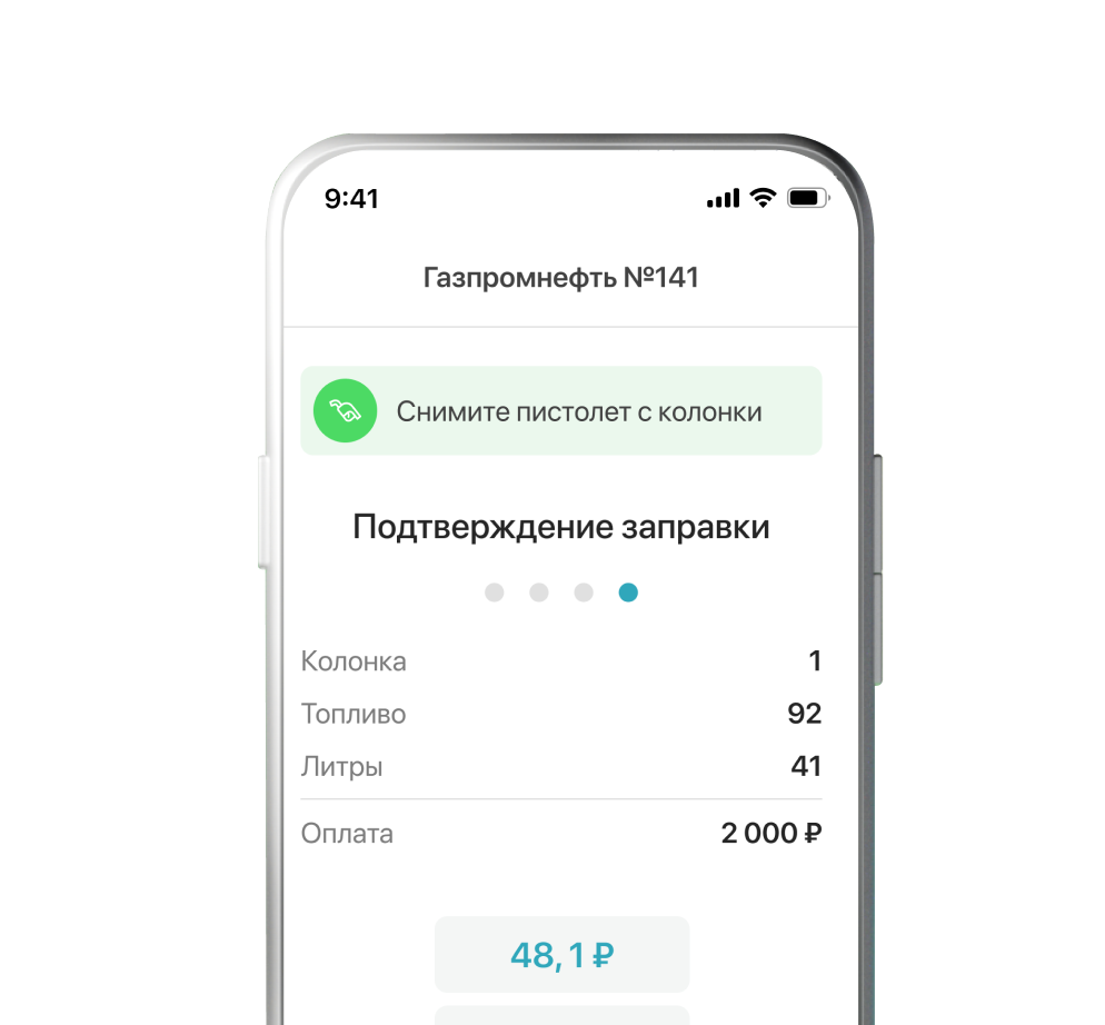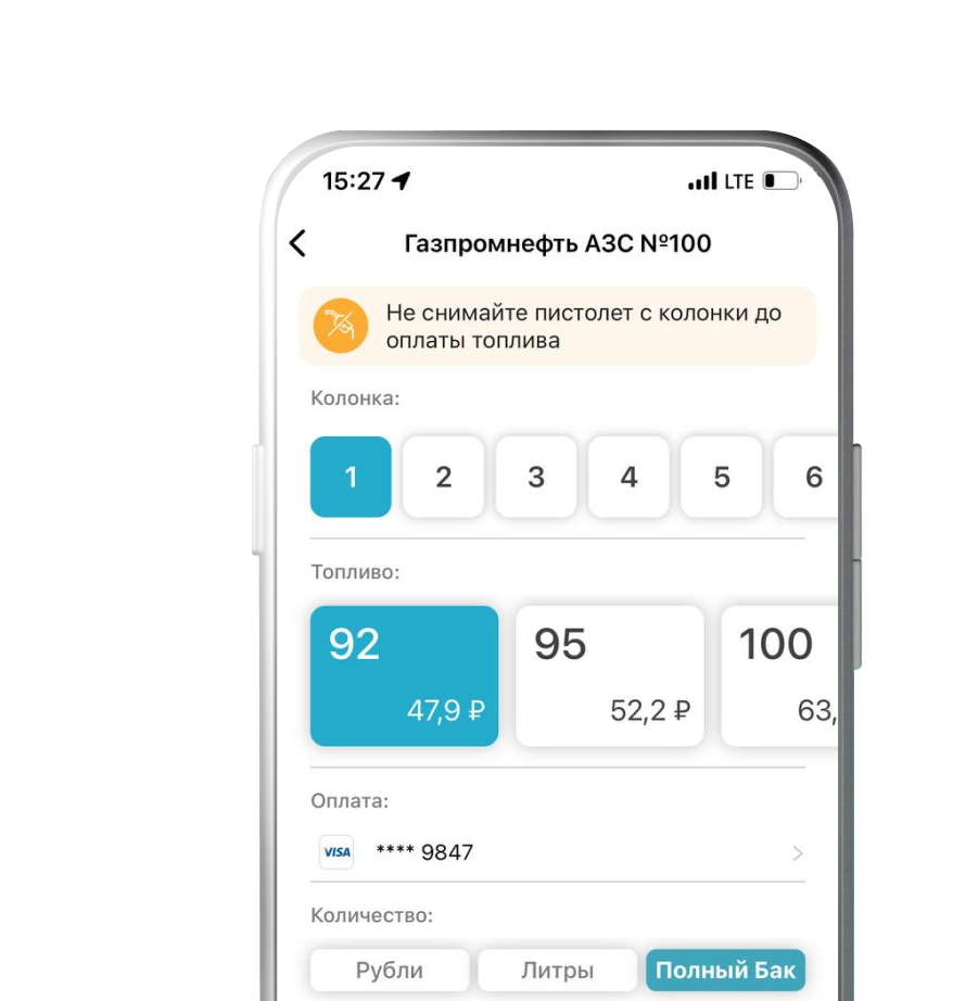 Выберите колонку, вид топлива и литраж, далее оплатите заправку (приложение подскажет, необходимо снять заправочный пистолет до оплаты или нет)